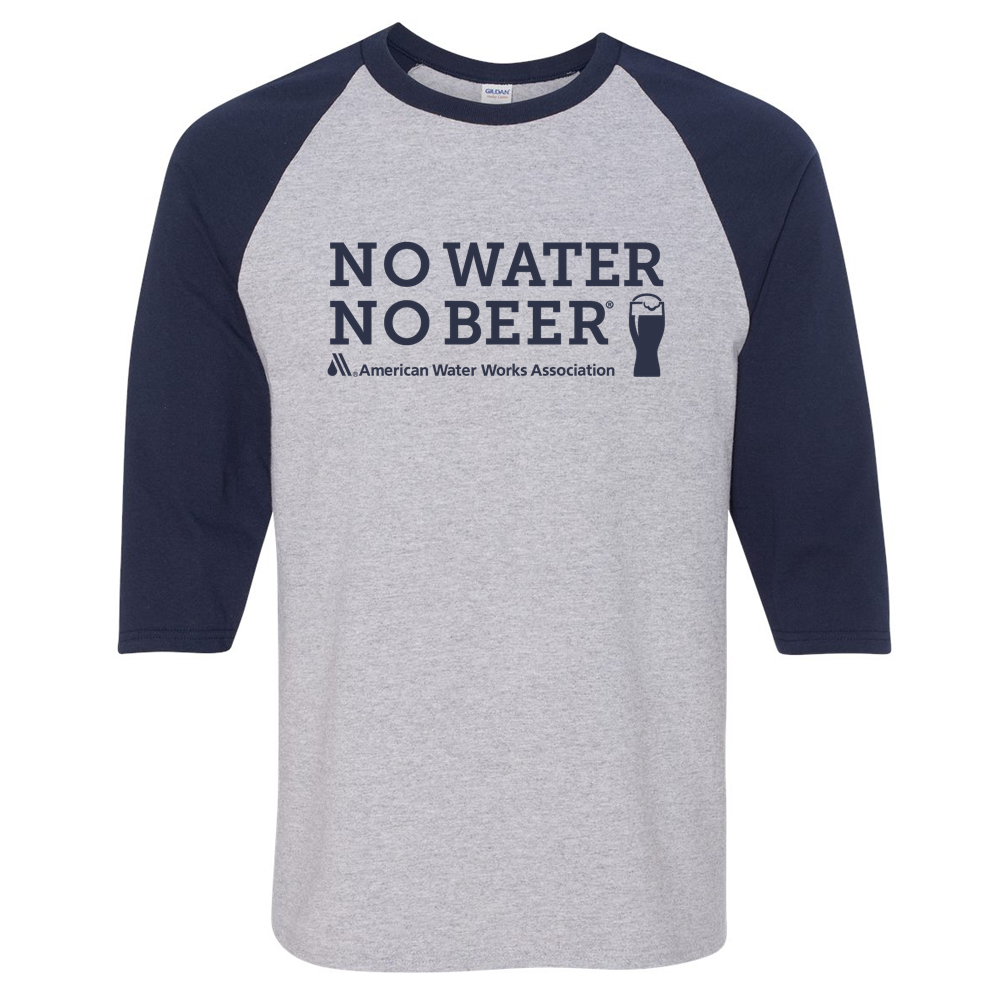 This 5.3-ounce, 100% cotton 3/4 sleeve raglan T-shirt features a contrast color set-in collar and 3/4 raglan sleeve, single-needle top stitched back neck, double-needle sleeve hems and bottom hem. Available in sizes S-3XL with the AWWA No Water No Beer logo imprinted across the front of the chest.