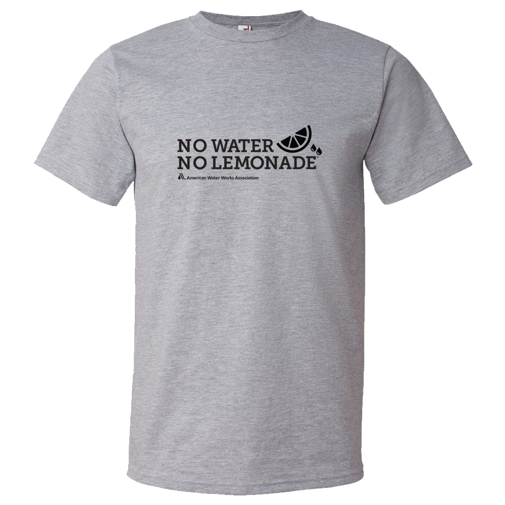 4.5 oz., pre-shrunk 90/10 cotton/polyester t-shirt has shoulder-to-shoulder taping, double-needle stitched sleeves and bottom hem with a TearAway label. The AWWA No Water No Lemonade logo is imprinted on full front of t-shirt.