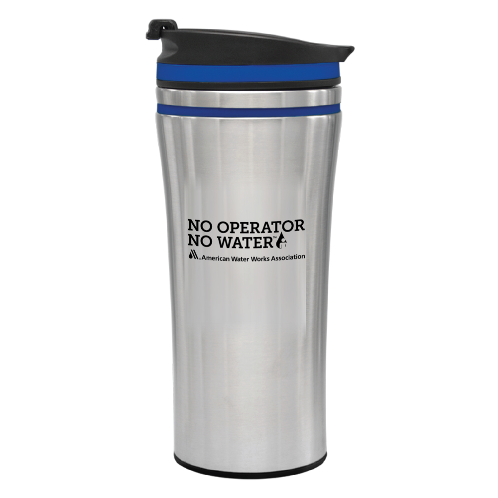 Composed of double walled stainless steel this solid stainless tumbler has an upper color band and matching twist on, flip open lid with snap closure. Available with a stainless steel finish with blue band and the AWWA logo imprinted on one side.